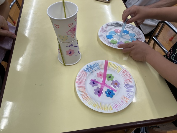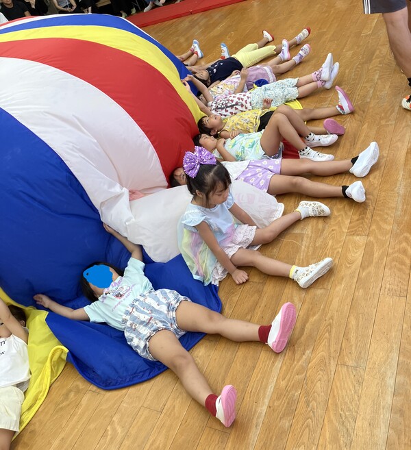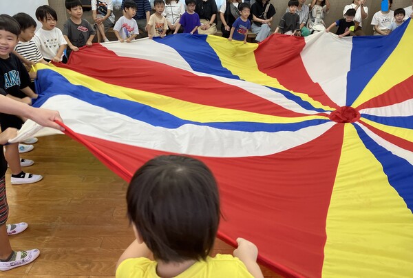 4歳すみれ組 パラバルーンに挑戦!「ひっぱれ〜!」と声を掛け合って頑張っています