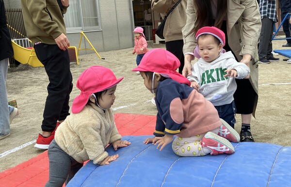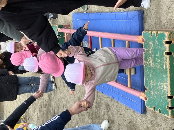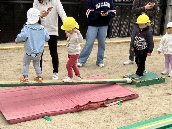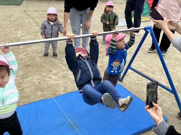秋晴れの晴天の下、子ども達の運動遊びの様子を見てもらったり、親子で一緒に運動遊びを楽しみました。