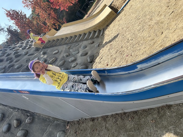 まずは大きな滑り台に挑戦!最初は少し怖がりながら滑ったり登ったりしていましたが、すぐに慣れてビューンとスピードに乗って滑ったり、急な斜面をスイスイ登ったりして楽しんでいました。