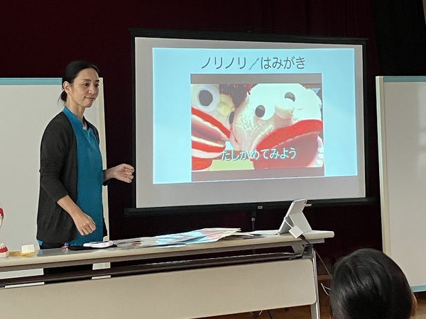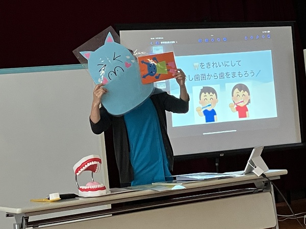 紙芝居で虫歯菌について教えて頂いたり、歯磨きの仕方がわかる「ノリノリ歯磨き」や、舌や口の周りの筋肉を鍛える「あいうべ体操」を教えて頂きました。
