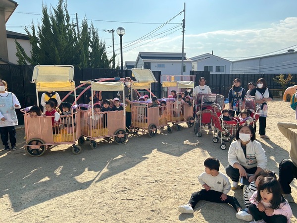 0・1歳児は二次避難の事も想定して散歩車に乗って避難します。誰も泣くことなく落ち着いて避難できました