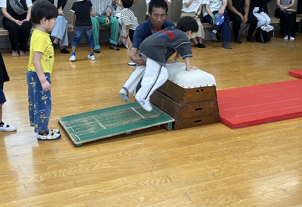 跳び箱にも挑戦!合言葉は「ドン・パカ」(踏切はドンと音が鳴るぐらい強く・パカっと足を広げる)です!