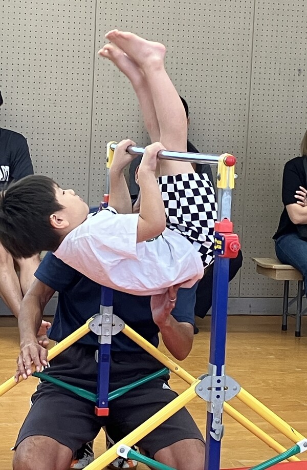 逆上がりに挑戦!しっかりと肘を曲げて、足を引き上げるのがポイントだそうです