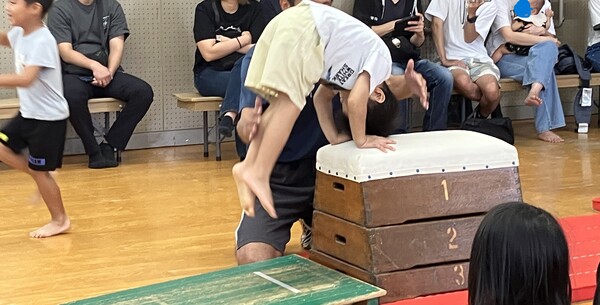 台上前転に挑戦!始めたばかりの頃は怖くてなかなか回れなかったんですが、しっかりと手をついて回れるようになってきました!