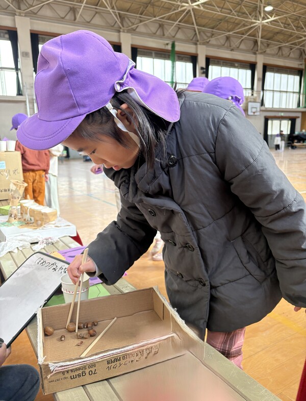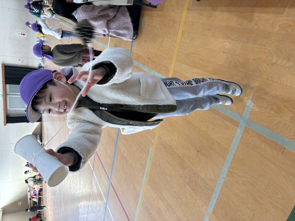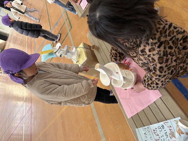 | 1月29日(木)明親小学校の「ふれあい交流会」に年長児ばら組が参加しました。 1年生の生徒さんが、生活科の授業で集めてきたどんぐりや松ぼっくりを使って、楽しいコーナーを作ってくれ、たくさん遊ばせてもらいました。 どんぐりの迷路や、松ぼっくりのけん玉、的あてなどは、どれもとても工夫されていて面白く、また遊ぶ時の注意点や、どのように遊ぶかも丁寧に教えてくれ、「さすが小学生!」と感心しました。 卒園児たちの成長した姿も見れて、短い時間でしたが、優しくて楽しい1年生とたくさん触れ合えてとても貴重な体験をさせていただきました。ありがとうございました! |