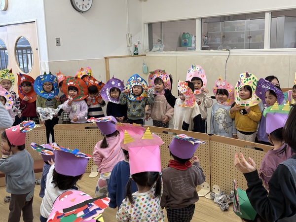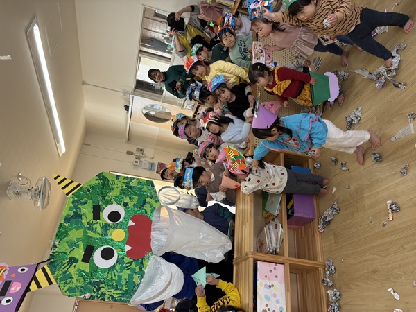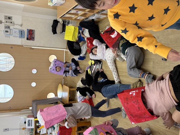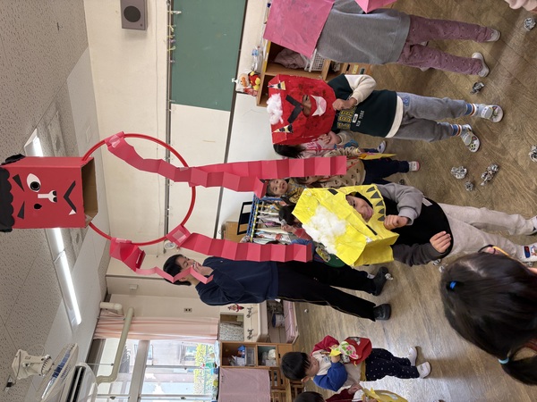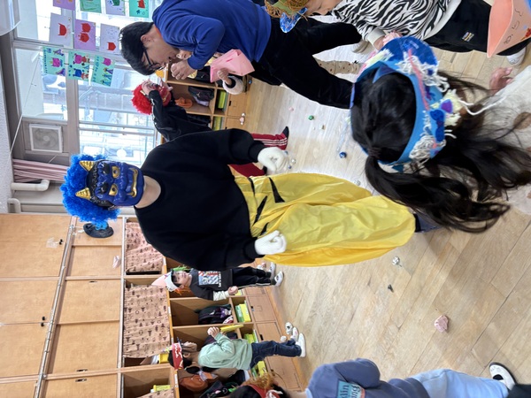 | 2月3日(火)各クラスで「節分の豆まき」を行いました。 自分たちで作った「鬼のグッズ」を身に付けて、新聞紙の豆で「鬼は外!、福は内!」と各クラスごとに豆まきを楽しんだ子ども達。 豆入れゲームや、チーム対抗豆まき合戦など、クラスごとに工夫して節分ならではの遊びを楽しみました! そのあとは鬼のお面を付けた幼児組が、乳児組の部屋を回って異年齢の豆まきタイム♪ 豆が当たると「やられた〜!」「痛い〜!」とやられた演技をしてくれるので、ドキドキしながらも一生懸命豆を投げていました。 回り終わってホッと一息ついていると、幼児組にのみ「大人の鬼」が登場!それまでの雰囲気が一転して「ギャ〜!」と逃げ回る子もいましたが、最後には鬼とハイタッチや握手をしたり、一緒に写真撮影して仲良しになりました☺ しっかりと邪気を払えたので、今年も1年健康で幸せに過ごしたいと思います! |