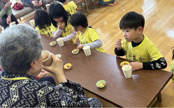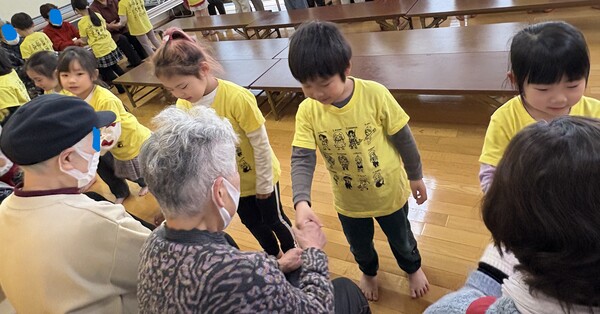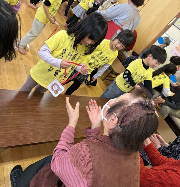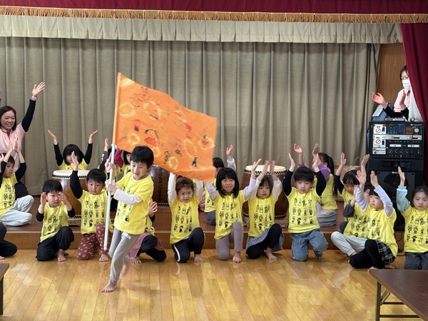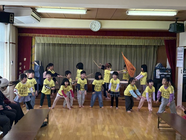 | 2月16日(月)年長児ばら組が、老人センターの方々と交流会をさせていただきました。 最初は運動会や秋まつりで披露した「和太鼓演技 ソーラン節」。「上手くできるかな〜」「ドキドキする〜」と緊張した様子でしたが、「どっこいしょ!どっこいしょ!」と声を出して踊っているうちに表情も和らいで元気いっぱい披露してくれました! そのあとはおじいちゃんおばあちゃんと「幸せなら手をたたこう」の歌に合わせて、ハイタッチしたり、肩たたきや握手をして触れ合いを楽しんだり、4チームに分かれて「じゃんけんリレー」をし、どのチームが一番早く全員が勝てるかを競ったりして大変盛り上がりました♪ 最後に「ゆき」「ドキドキドン1年生」の歌をうたい、手作りのメダルを渡した後は、用意していただいたココアとクッキーをいただき、ほっこりと幸せいっぱいの楽しい時間を過ごしました♡ |