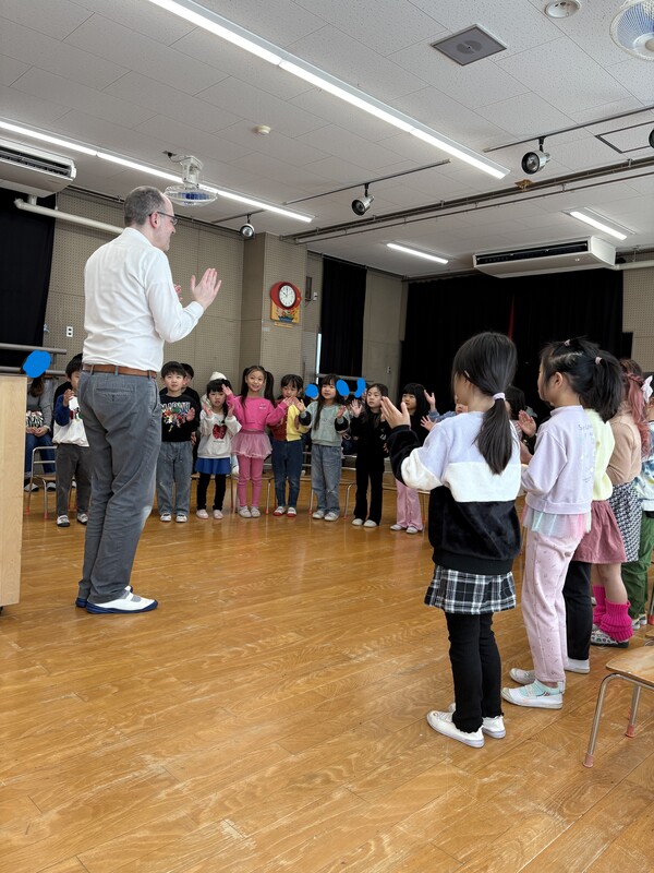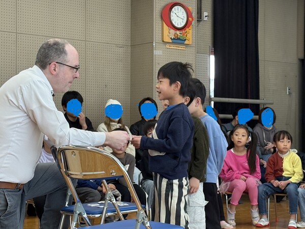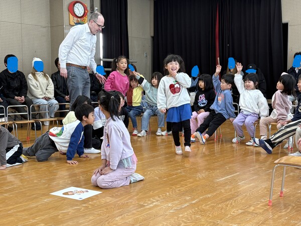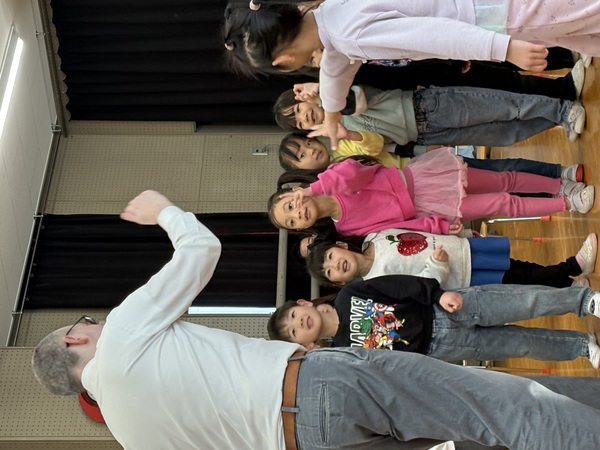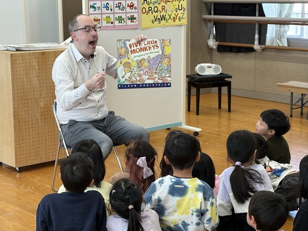 | 2月18日(水)ばら組「ECC教室参観」を行いました。 4月から英語に親しんできて、ECC教室が大好きなばら組の子ども達!今日は初めてネイティブの講師が来られるということで少しドキドキしていましたが、 優しく、ユーモアたっぷりのエリック先生とすぐに仲良くなり、普段通りのECC教室の様子を見て頂くことが出来ました。 レッスンでは、つみき、ボール、人形、縄跳び、クマのぬいぐるみのカードを使って、「好きなカードはどれ?」という質問に答えたり、一人ひとりカードを持って「フルーツバスケット」の様に席を移動して遊んだり、楽しみながら英単語を学ぶことが出来ました! 最後には絵本も読んでいただき、表情豊かなエリック先生と大笑いしながら楽しんでいました♪ これからも英語に触れることで、発音やリズムを楽しみながら、英語に親しむ土台作りをしていきたいと思います。 |